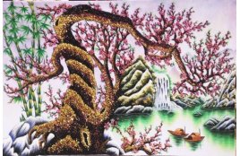 Tranh đá quý hoa đào mô tả hình tượng cây đào lâu năm đứng bên khóm trúc, con sông, thác nước và những con thuyền bé bé phía xa gợi nên một khung cảnh một mơ, nên thơ và báo hiệu một mùa xuân đầm ấm, đầy ắp tiến cười rộn rã sắp tới.