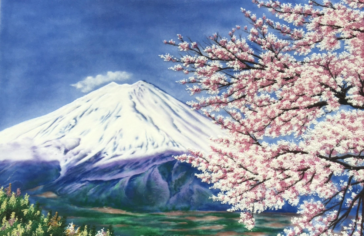 Mẫu tranh đá quý núi Phú Sỹ được kết hợp hài hòa giữa khung cảnh nhìn từ xa, ngọn núi phủ đầy tuyết trắng, phía xa xa có những ngôi nhà hiện đại bên con sông và nét đặc trưng đó là cành hoa anh đào (sakura) một loài hoa giữ nét đặc biệt trong văn hóa người Nhật.